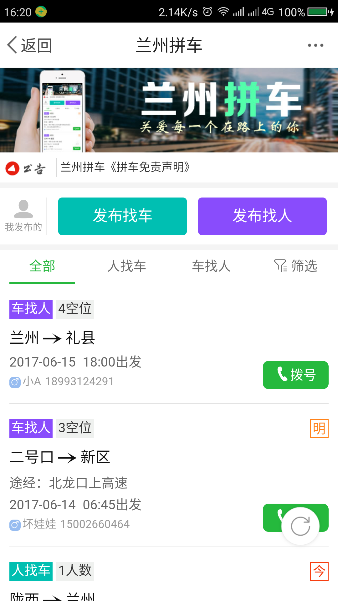 兰州论坛旗下专业的顺风车/拼车信息免费发布平台,拼车出行,绿色环保,方便你我!