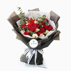主要花材:1枝粉绣球,16枝粉玫瑰,5枝粉桔梗,11枝粉康乃馨,11枝栀子叶,9枝尤加利叶,粉白色双面包装多层精美,黑色字母缎带蝴蝶结,三脚架一个