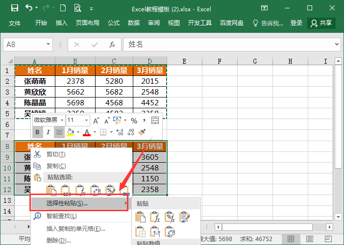 1.先复制第一个表格上的数据,之后,选中第二个表格数据,右键【选择性粘贴】。