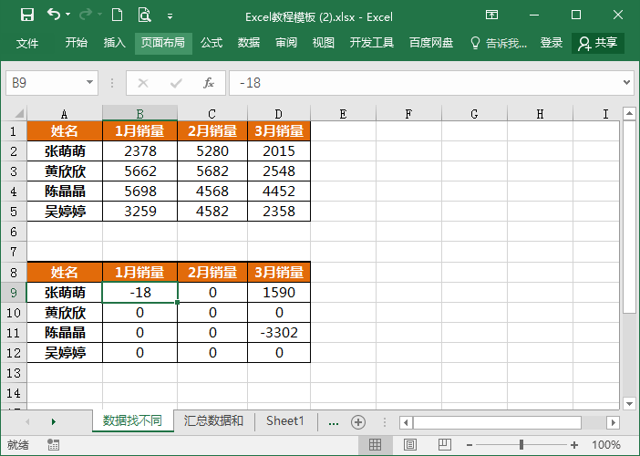 3.当表格上的数据出现的是0的话,说明这两个数据是相同的,反之就是不同之处。