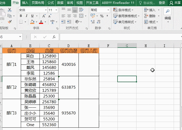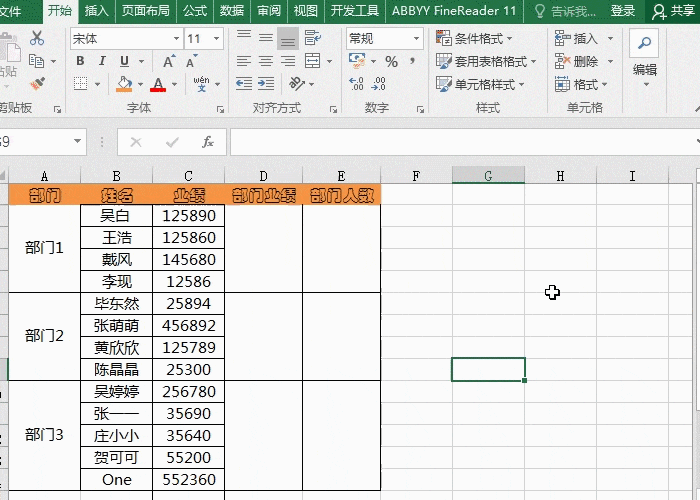 选中部门人数下的单元格,输入公式【=counta(B2:B14)-sum(E3:E14)】,再用快捷键【Ctrl+回车】,就能计数。