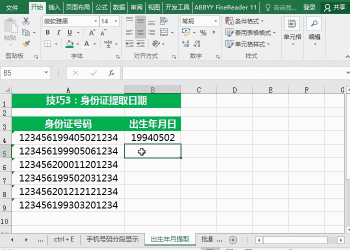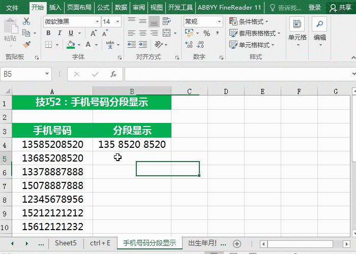 在要显示的单元格下先输入分段后的格式数据,再使用Ctrl+E一键填充其它的单元格。