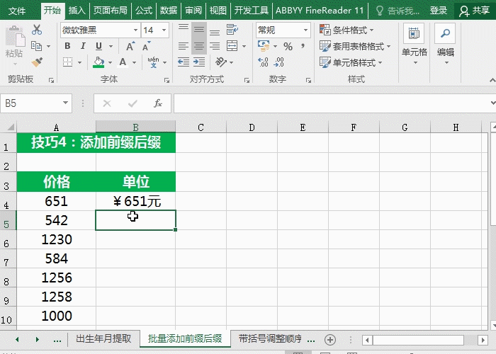 在单元格中先输入要添加的前缀后缀内容后,再用Ctrl+E自动填充剩下的单元格,实现批量添加前缀后缀。