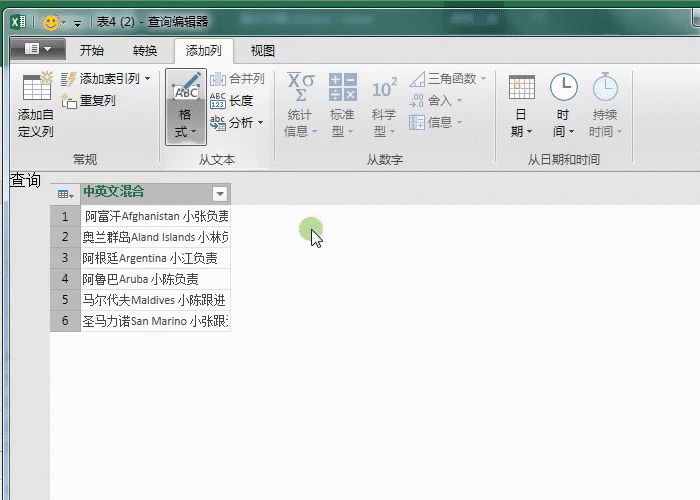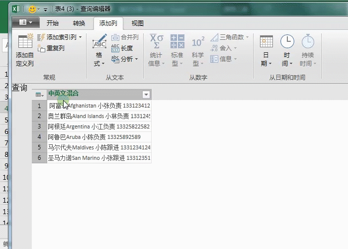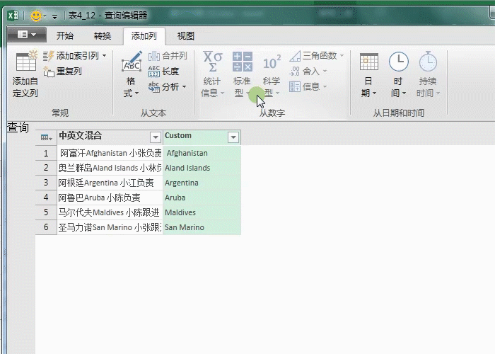 2、在查询编辑器中点击添加列-自定义列,输入这个公式=Text.Remove([中英文混合],{"一".."龟"})(文末有解析)